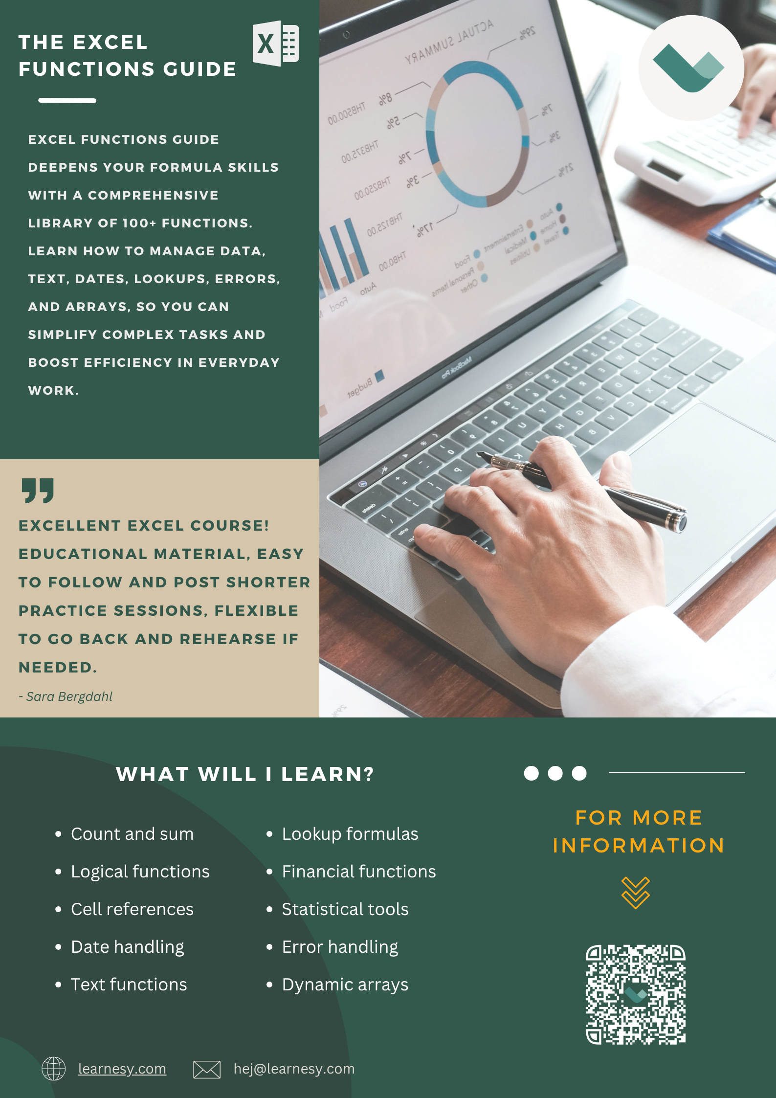 The Excel Functions Guide is a continuation course for those who want to expand their competence within the program’s many functions. Prior knowledge of Excel is required. If you’re lacking said knowledge, we can recommend our course Excel Essentials. In addition to the more basic functions, you will also learn dynamic array functions and how to handle error messages. When you handle multiple functions, you can save time in your work because you can often replace multiple elements with a single formula. Last but not least – to become an advanced Excel user, you must be able to master functions.