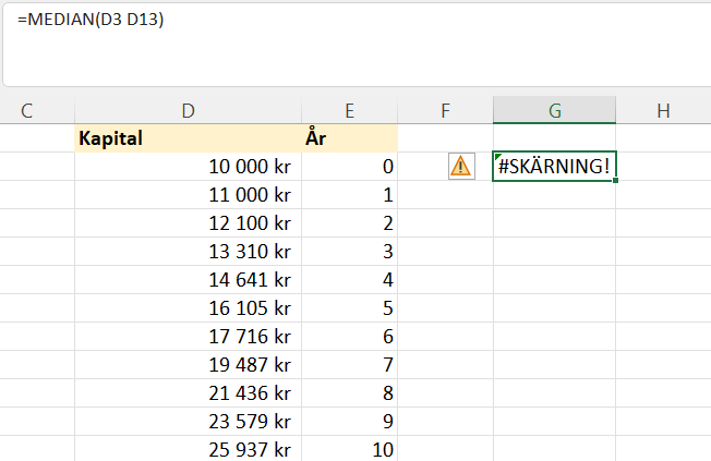 A colon is used between two cell references to indicate a cell range. With this error message, Excel is telling the user that the two cell ranges D3 and D13 do not intersect. As shown, this is an easy problem to fix.
