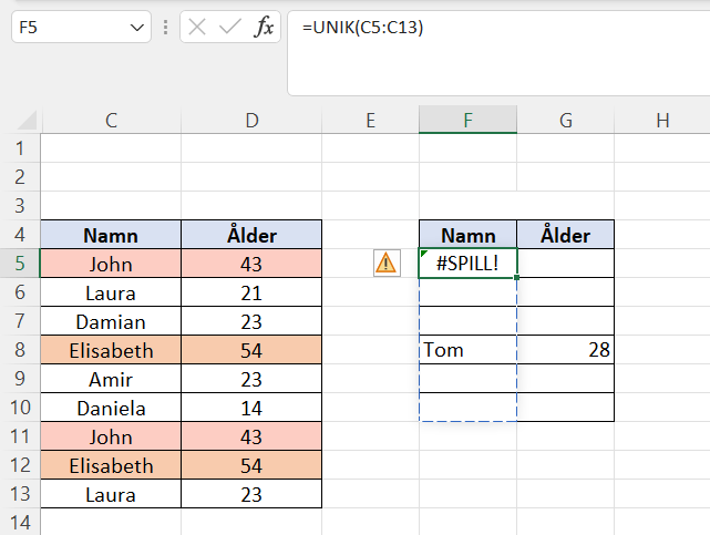 The UNIQUE() function retrieves the unique names from the array on the left. However, here a value is âblockingâ the function, and the function instead returns #SPILL!. If you remove the value that blocks the functionâs output, the function will work normally again. If you have never encountered this error before, it may be because you are using an older version of Excel.