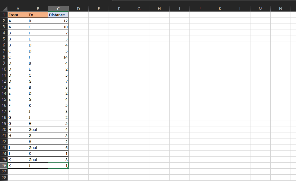Let’s create a new sheet where we will work out the shortest path for this particular network. We will start by mapping all the different routes with their respective distances.