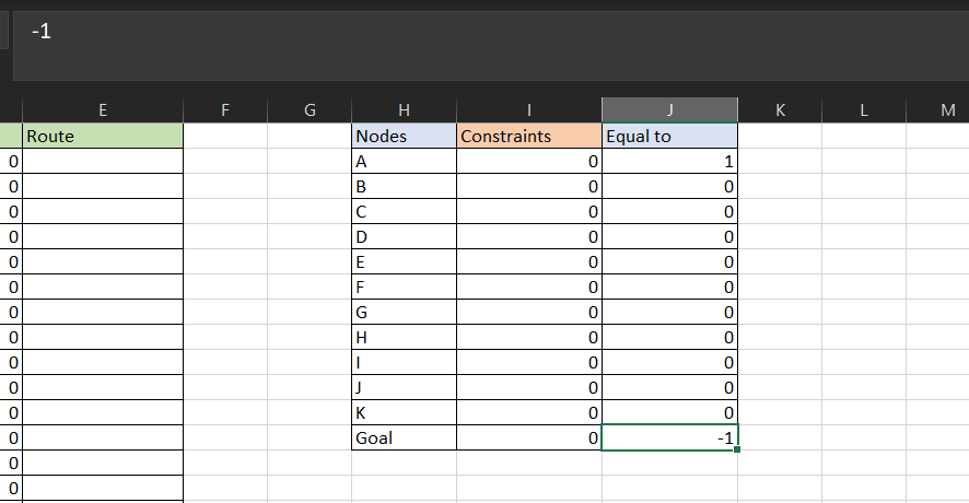 Now we need to create a new table for the constraints that we will pass into the solver. In the first column, we will map all the nodes. In the “Constraints” column we will set up a function that will tell the solver our constraints. Since we are looking for a single route. Type = SUMIF($A$2:$A$26;H2;$D$2:$D$26) – SUMIF($B$2:$B$26;H2;$D$2:$D$26)