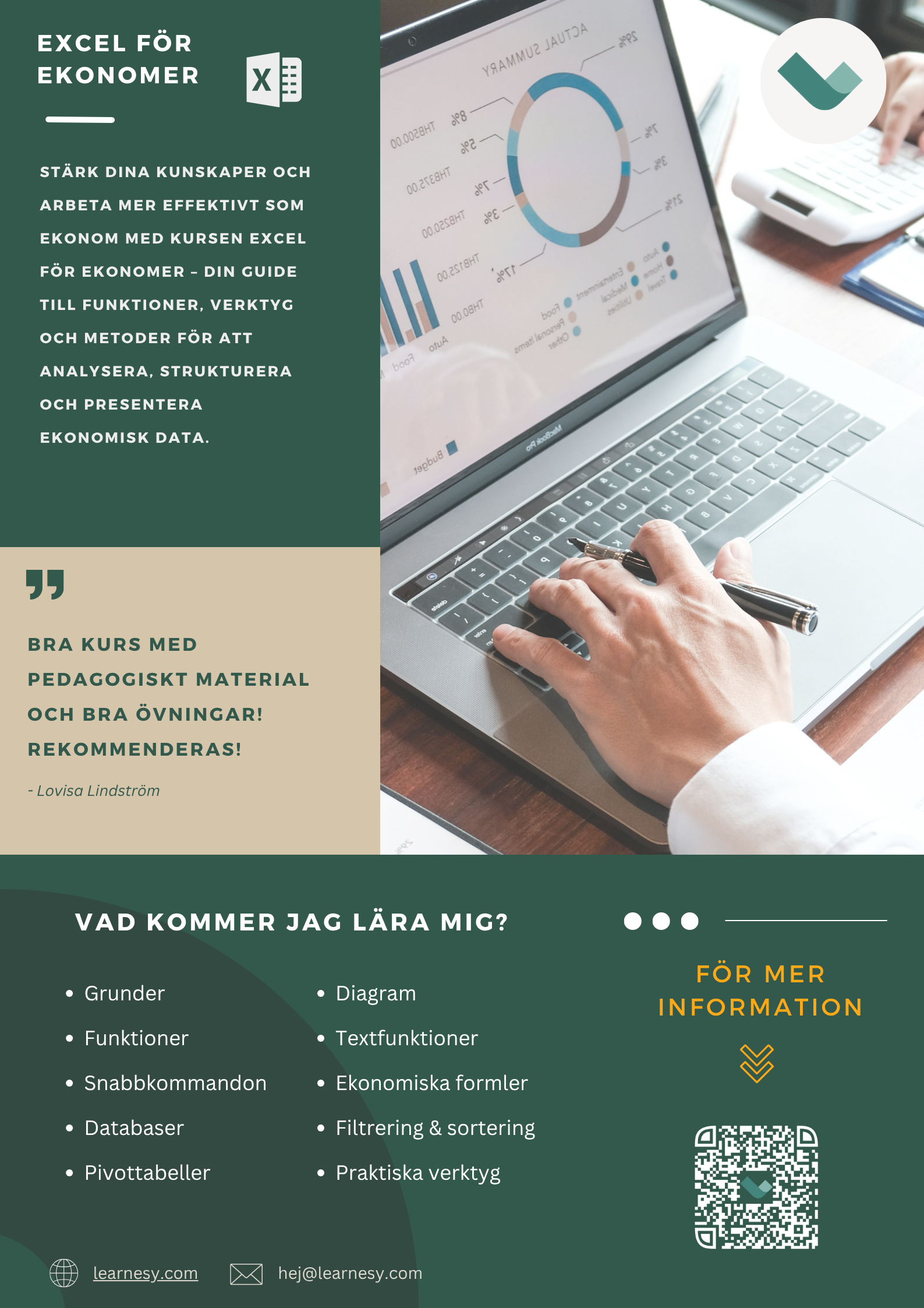 Mitt namn är Niklas och jag har varit verksam som Excel-utbildare hos Learnesy under flera år. Mitt mål med denna kurs är att du inte bara ska bli kompetent i att använda Excel, utan även känna dig trygg i din förmåga att praktiskt tillämpa dessa kunskaper i ditt dagliga arbete. Därför kommer du i denna kurs att få lära dig grundläggande Excel-kunskaper för att sedan applicera detta i hanterbara övningsuppgifter som efterliknar scenarier som du som ekonom kan komma ställas inför.