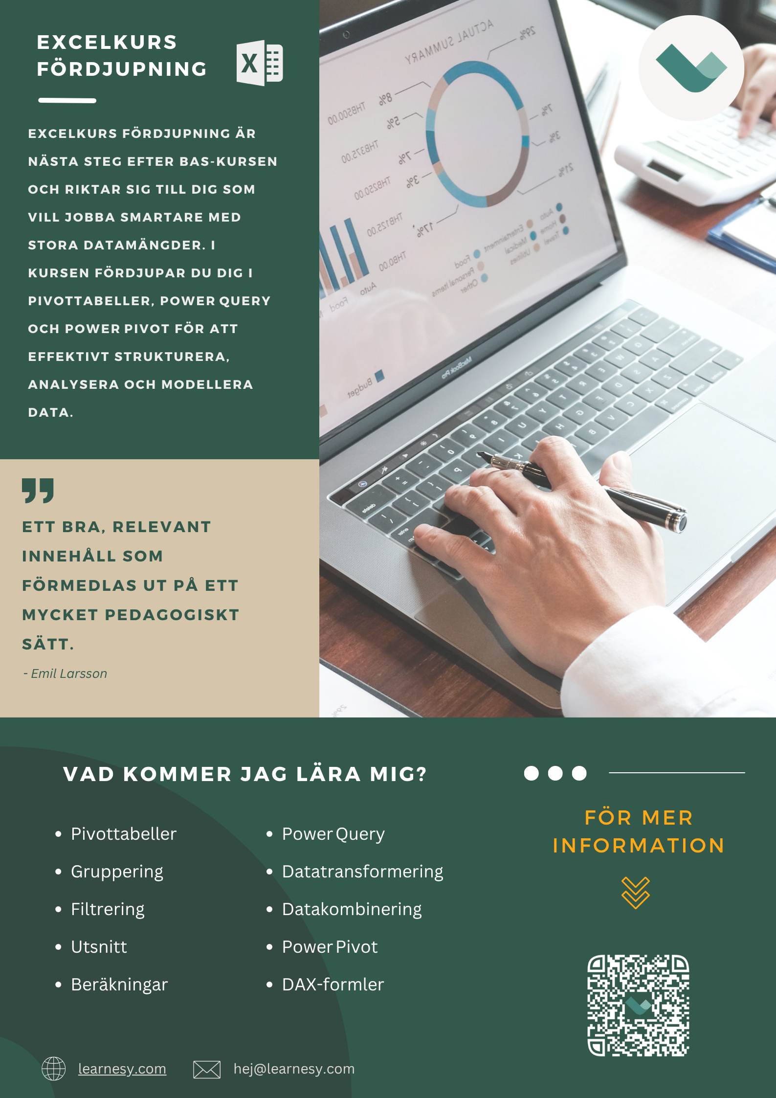 Mitt namn är Emil, och jag har haft nöjet att vara Excel-instruktör hos Learnesy i många år. I Excelkurs fördjupning fokuserar vi på de kraftfulla verktygen Pivottabeller, Power Query och Power Pivot, med målet att du inte bara ska förstå dem, utan också kunna använda dem självständigt för avancerad dataanalys.