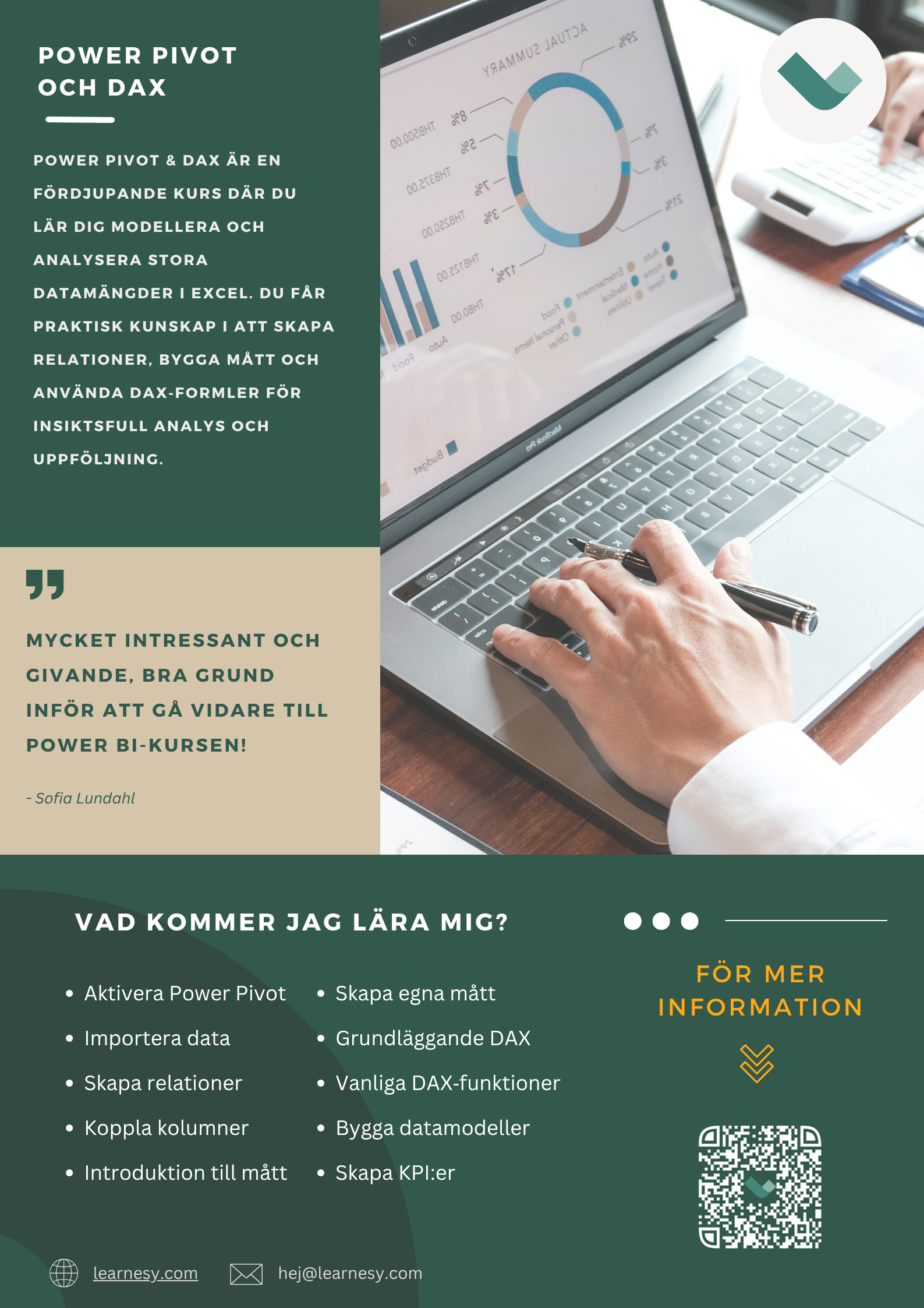Power Pivot och DAX är en grundkurs i Power Pivot och DAX, som förutsätter grundläggande kunskaper i Excel. Power Pivot är ett Excel-tillägg som kan användas för dataanalys och för att skapa datamodeller. Power Pivot använder sig av formelspråket DAX som tillåter användaren skapa ny information med hjälp av beräkningar.