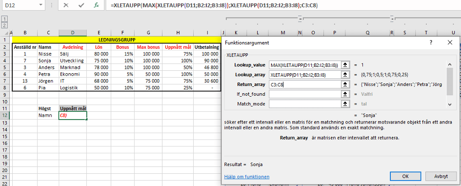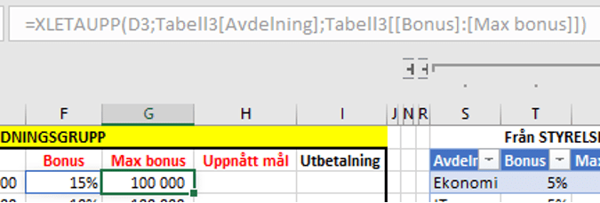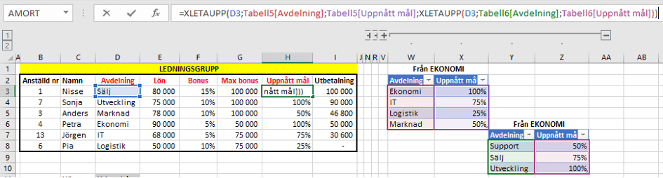 =XLETAUPP(D3;Tabell5[Avdelning];Tabell5[Uppnått mål];XLETAUPP(D3;Tabell6[Avdelning];Tabell6[Uppnått mål]))