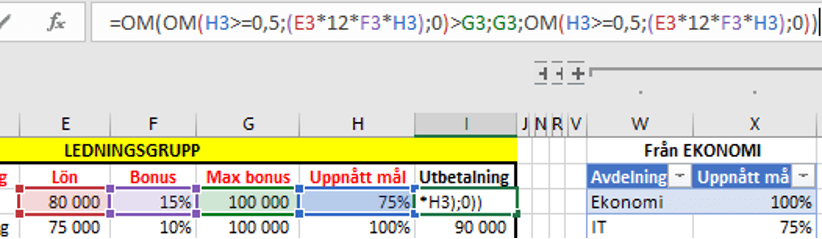 Vi ser nu att vår beräkning för ledningsgruppen är klar och Nisse är den som får mest i bonus då han får ut max bonus på 100 tkr. Nisse har uppnått 75% av målet och har hela 80 tkr i månadslön varmed han för detta skulle fått 108 tkr om styrelsen inte satt ett tak på 100 tkr. Pia är den enda i ledningsgruppen som inte får någon bonus då kravet är att uppnå minst 50% av målet.