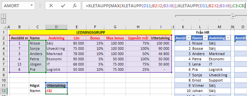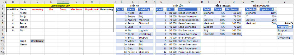 I nedan exempel ser ni att man kan fånga upp ett värde till vänster om LETAUPP-värdet. Detta går inte i LETARAD (jag har dock hittat en workaround på detta). Namnen i ledningsgruppen ska hittas i tabellen från Löneavdelningen och vi vill mappa in aktuella löner.