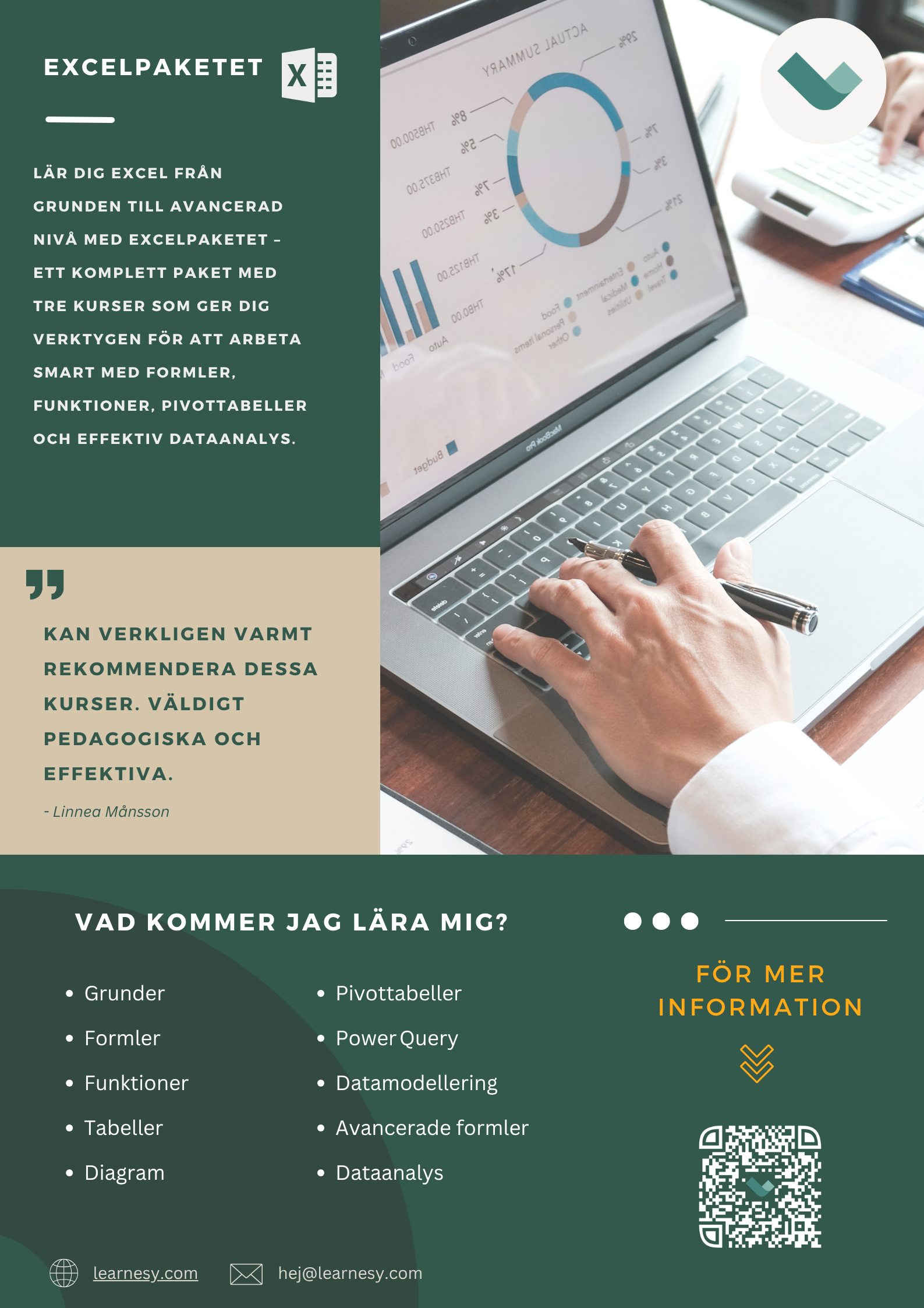 Du får tillgång till fyra kurser till ett paketpris som är billigare än att köpa dem var för sig. Det ger dig både bredd och djup inom Excel – från grund till avancerad nivå.