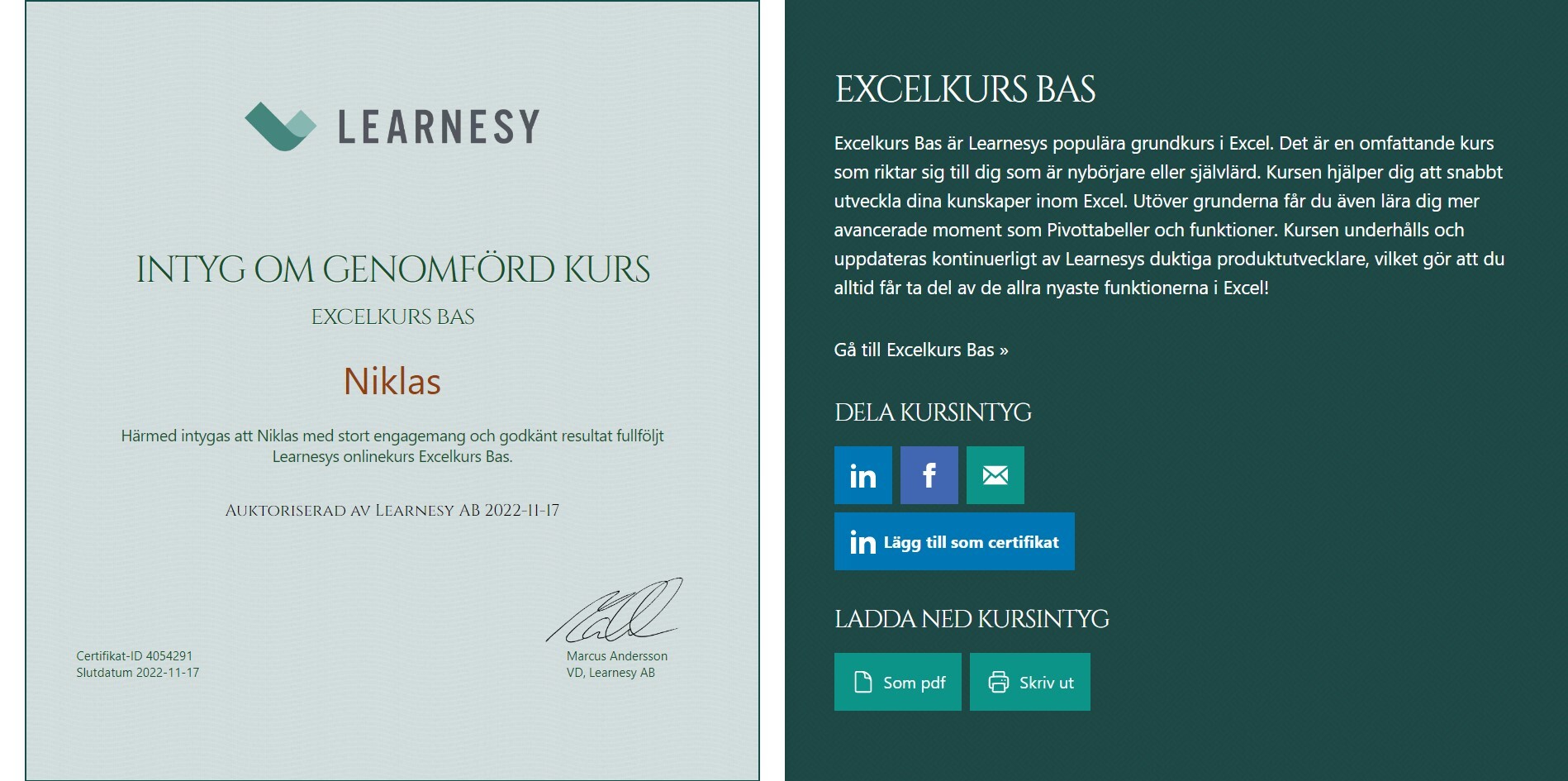 Ett intyg på att du har fullfört en kurs i Excel, Power BI, SQL eller PowerPoint kan vara skillnaden på om du blir kallad på en intervju, får en praktikplats eller till och med ett nytt jobb. Därför kan du numera dela ditt diplom på LinkedIn eller ladda ned det som pdf med några få musklick!