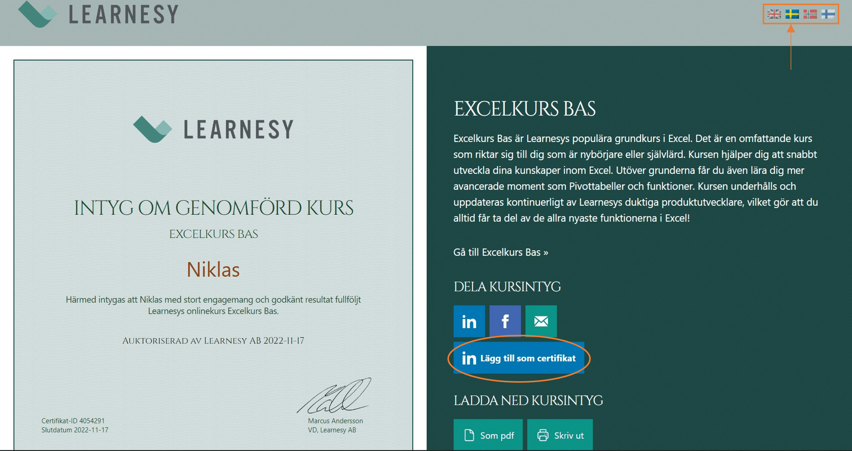 Ändra till svenska – om så önskas – och tryck på Lägg till som certifikat. Man kommer nu transfereras till LinkedIn.