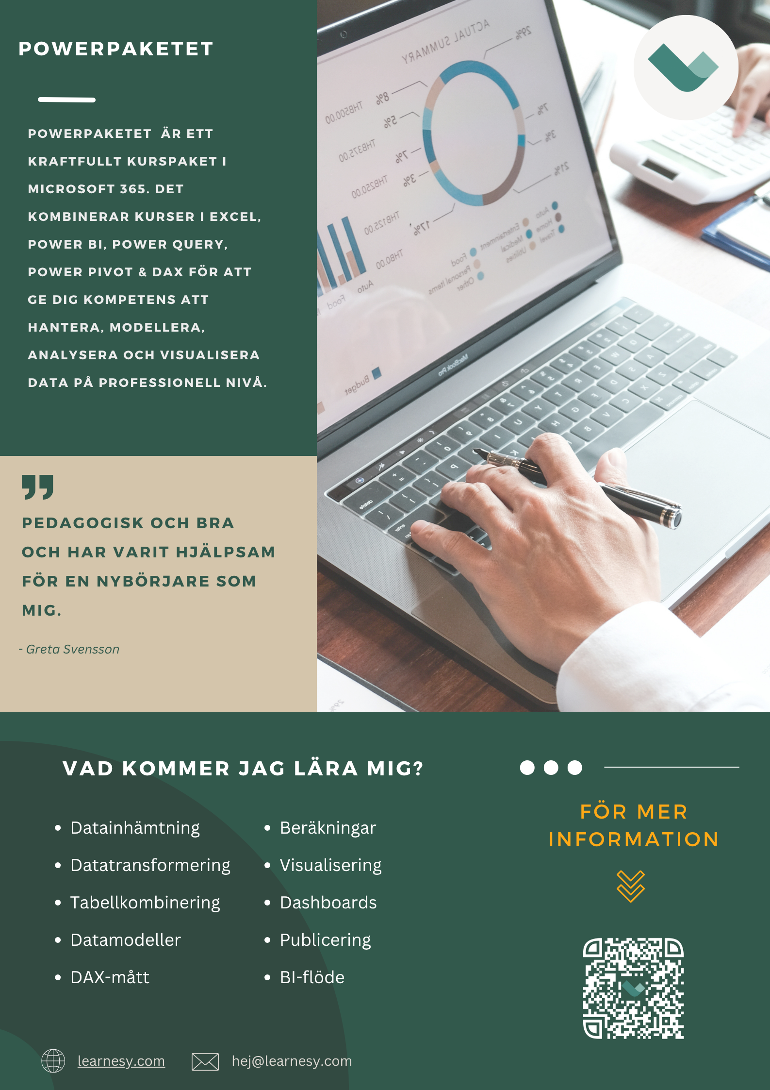 Paketen är designat för analytiker, ekonomer, controllers eller alla som vill jobba datadrivet och ta sin Excel- och BI-kompetens till nästa nivå utan förkunskaper.